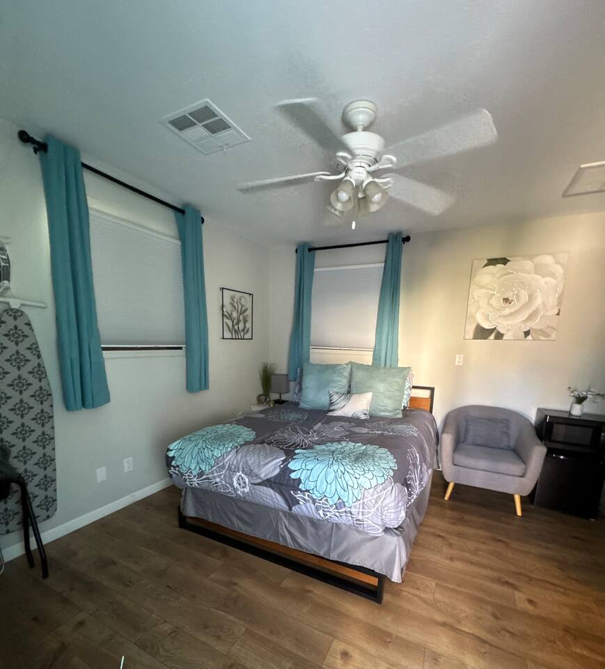 Our casita is a private entry, cozy room connected to the main house. It’s furnished with a queen bed with medium/firm memory foam mattress with a mattress pad cover. It’s a nice, comfortable room with a full bath, iron & ironing board, luggage rack, mini fridge, microwave, tray tables, a chair & smart tv,. Perfect for short stays. There is a portable fan & space heater & chairs that can be used to sit out front. The backyard is for the use of the main house guests/owner for their privacy.